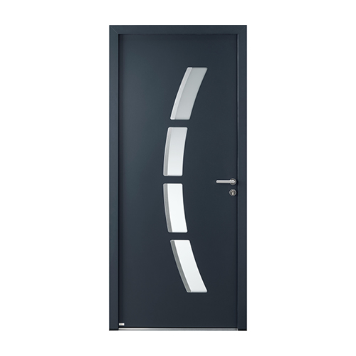 Porte d’entrée associée à un fixe en dormant vitré. Décor ton inox, vitrage sablé classe 2, poignée moderne sur rosace. Gris 7016 texturé