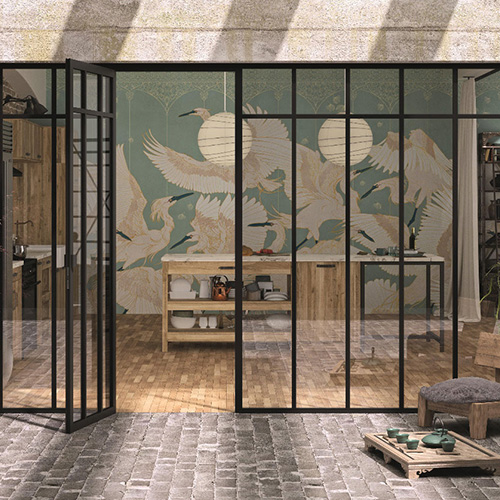 Différentes versions de verrières sont proposées, de la plus classique à la plus contemporaine, avec des portes qualitatives et robustes avec leur cadre en aluminium thermolaqué de 36 mm et leur verre trempé de 4 mm, ainsi que de nombreuses possibilités décoratives :